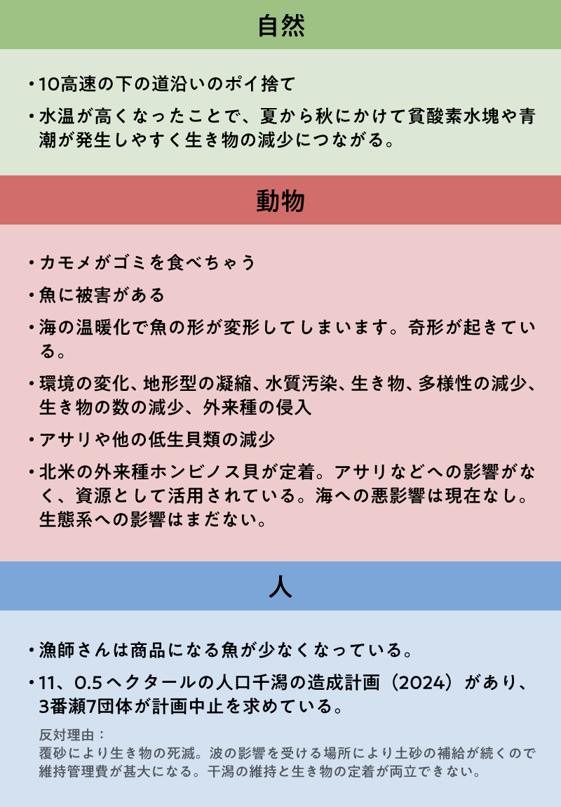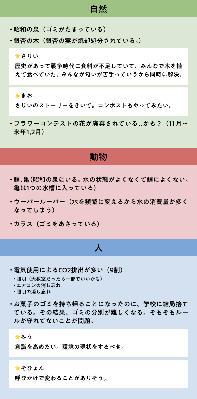 参加者たちは、自分たちの住む地域や学校を見つめ直しながら、自然・動物・人の視点から意見を出し合いました。「海の環境汚染や生物多様性の変化」や「校内に植えられている樹木の歴史との向き合い方」など、身近だけれど見過ごされがちな課題にも注目しました。